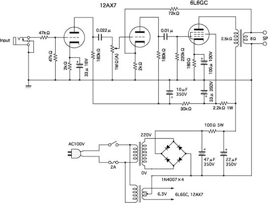 回路図はあるので、クローンを作っても良かったのだろうが、何となく自分だけのものが作ってみたい気の方が大きく、自前で設計してみた。とはいえ、ベースになる回路をFender Champシリーズのシングルエンドの小出力のものとし、電源電圧を下げ、整流管をダイオードにして、回路係数を設計し直したものである。今では、シングルエンドなら何とか設計できるようになっているのである。パワー管に6L6GC、プリアンプ部には12AX7を一本使い、二段増幅する、もっともシンプルな構成である。設計と言っても、ハイファイアンプじゃない、という意識があるので結構大雑把である。まず電源電圧を決め、後は、特性表を手に入れて負荷線を簡単に引いて、バイアス電圧を決めて、カソードの抵抗値を決定するていどである。オーディオの場合は、歪み率最小条件などいろいろあるようなのだが、すべて無視である。これは、後で聞いた話しだが、プッシュプルの片方の真空管を抜いて鳴らしたら、凄まじくいい音だった、などという報告まであるのがギターアンプの世界である。種明かしは、AB級シングルエンドになったせいで波形が上下非対称、その音が最高、という訳である。ハイファイオーディオとはかなり世界が異なっている。
