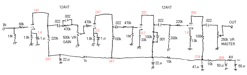 このグリッドに直列に入る抵抗だが、この後の段でもグリッドの入力部分に220kや470kとかけっこうでかい抵抗がシリーズに入っていて、これでかなり高域が落ちる。この抵抗は、意識的に高域を落としているという意味もあるだろうが、高域の発振止めや、放送電波の入り込みなどを防止する意味もある。