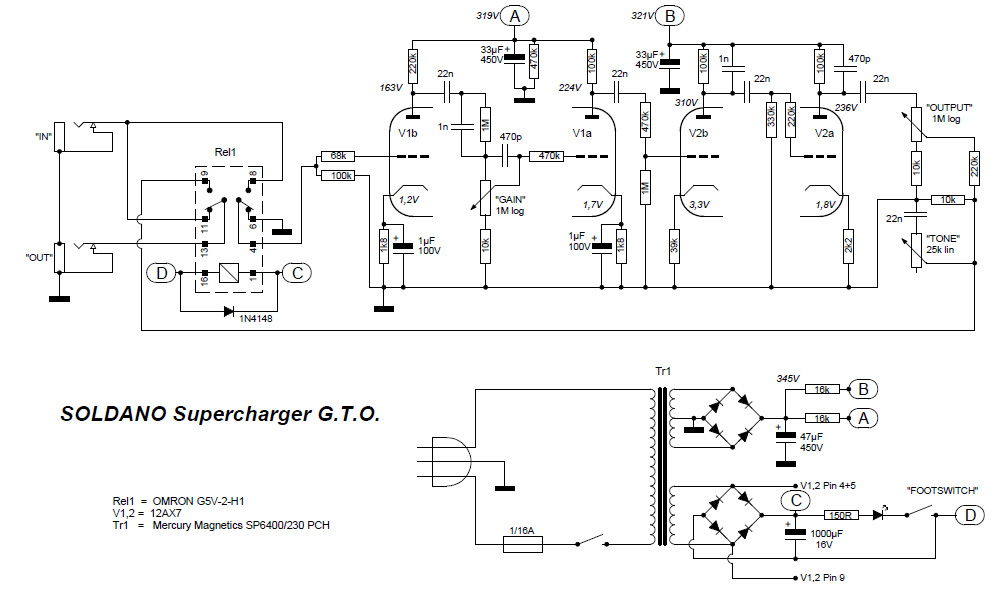 これは一種のエフェクターとして使う代物のようだが、回路を見てみるとSoldanoのアンプのプリアンプ部そのままを取り出したものである。今回、はちょうどプリアンプ部だけ紹介するので、このSuperchargerを解析しているようなものである。