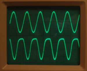 グリッドの470kΩの手前に信号を入れると10Vp-pを超えると歪み始めるが、右の写真は30Vppを入れたときの出力波形である。みごとに上側がつぶれている。