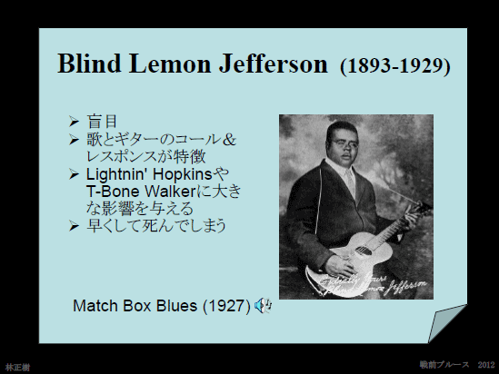 盲目のブルースマンで、先ほど書いたように、歌とギターのコール・アンド・レスポンスが見事です。この人はデルタブルースにおけるチャーリー・パットンみたいな存在で、とても人気があったそうです。