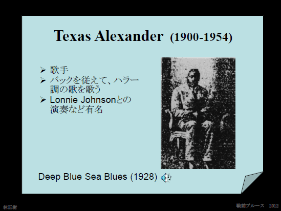 次はテキサス・アレクサンダーです。この人は純然たるシンガーで楽器はやらなかったそうです。なので、いろいろなギタリスト、ピアニスト、バンドと活動していました。話によると身長が低くて風采がぱっとしない男だった、などとも言われていましたが、その声は低くて深くて伸びのあるいい声です。