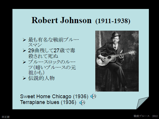 そんなわけで彼は非常に有名なせいもあり、さらに、この僕自身がロバート・ジョンソンがもっとも好きな戦前ブルースマンであるということ、しかも自分でも彼の曲をもう30年以上弾き語りで弾いて歌ってきたということもあり、語り出したらめちゃくちゃ長くなってしまい、彼だけで他の講座が必要になっちゃいます。