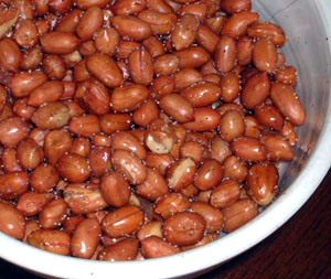 ◆鍋にきれいな油を入れ、温度が低いうちから生ピーナッツを入れ、中火でかき混ぜながら、若干色づくまで揚げる