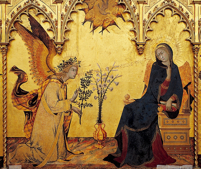 狭い部屋の中の、この偶然の、ということは神の命による必然の邂逅の瞬間は、何か中世的な恋愛物語の一場面を髣髴とさせるようなところがあった。ガブリエルの僅かに開いた口から受胎を告げる言葉がマリアに向かって流れ出ている。金箔を貼った背景に文字を浮き出させ、それはこの官能的な絵を正当化するために添えられた詩句のようにも思われた。