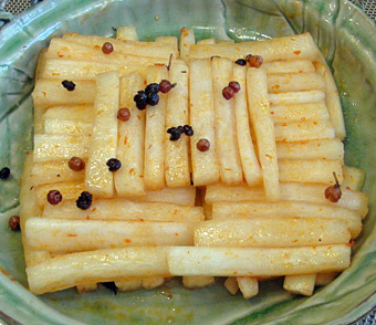 ダイコンの辛み甘酢漬け これも簡単にできておいしいダイコンのつけもの。ダイコンを甘酢に漬けて気長に中まで染み込ませるのがコツ。今回、粒山椒を油で炒めたいわゆる花椒油を加えて香りをプラスしました。出す直前に豆板醤とゴマ油で合えるのがコツです。時間が経つと豆板醤の味と香りがぼけてしまいます。 → レシピはこちら |