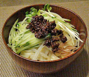 北京風ジャージャー麺 コース最後のミニジャージャー麺です。今回、かいわれ大根とミョウガを加えて日本っぽくしてます。ジャージャー麺の本場は北京ですが、以前北京で食べたときのお店では、7、8種類の薬味を乗せて混ぜて食べるものでした。肉ミソに使った味噌は北京で買ってきた黄醤(ホア・ジャン)を使ったので本場の味ですね。ただ、この黄醤はほとんど八丁ミソと同じなので、日本では甜面醤や八丁ミソでOKです。油を多めに使って肉ミソを作り、うどんの乾麺に油が滑らかにからむようにするのがコツです。あと、麺にうどんの乾麺を使いましたが、これが北京で使っている麺に一番近いんです。 → レシピはこちら |