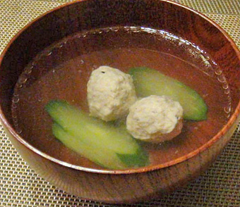 肉団子のスープ スープは棒棒鶏を作ったときに鶏胸肉で取ったものです。豚ひき肉の肉団子を入れるとこれにさらに豚肉のうまみがプラスされてなかなかおいしいダシになります。やっぱり鶏ガラで取ったスープより繊細な感じになりますね。肉団子スープは、肉団子を作るとき水をたくさん入れてお団子をスープにつりあう柔らかさにするのがコツです。夏らしくキュウリを入れてみました。 → レシピはこちら |