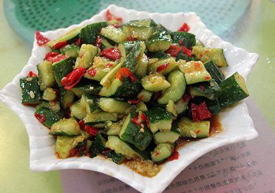 まずは、これ。キュウリの辛みあえ、赤いトウガラシがたくさん入っているが、辛みはそれほどではなくて、生のキュウリをショウユと酢でその場であえてすぐ出した感じの食べ飽きないあっさりとした味。