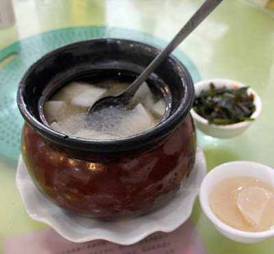 こういう土器のような壺に入ってスープが出てくるのは、こちらの定番なのだろう。これは大根のスープ。豚肉でダシを取ったやさしい味である。