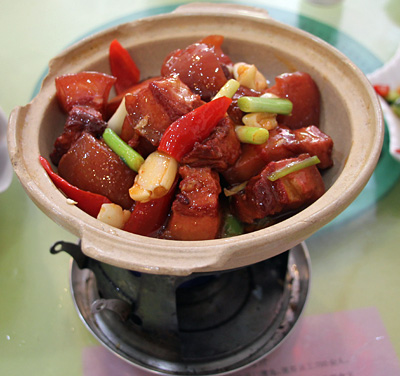 はい、しょっぱなから出ました、これがかの有名な紅焼肉(ホン・シャオ・ロウ)。なぜ有名かというと湖南省出身の毛沢東の大好物だったから。毛沢東はこの紅焼肉とトウガラシがあれば自分は生きて行ける、と言ったそうだ。豚のバラ肉をショウユで煮た変哲のない料理なのだけど、これはうまい。それで、ホントに赤い色をしているのにも感心した。日本のショウユだと黒くなってしまうけど、たしかに赤い。ぶつ切りのネギ、それから真っ赤なトウガラシも入っている。このトウガラシもさっきのキュウリのときと同じくほとんど辛くなくて、脂っこい豚肉とトウガラシとネギを一緒に食うとかなり幸せな味である。