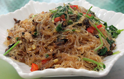 春雨の炒めもの。いろいろな野菜と一緒にショウユ味に炒めた、やさしいお惣菜っぽい料理