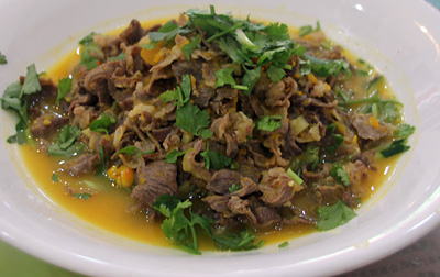 牛肉を酸味をきかせて炒めたもの。黄色いのはたしかトウガラシだったと思うんだけど、忘れてしまった。あとで聞かないと。香菜もふんだんに入って、家庭料理風の仕上げと味なんだけど、これがうまくて箸が止まらないんだよね。