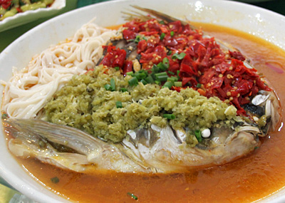 この一品は、たぶん湖南料理の典型だと思う。トウガラシと酢を利かせた魚の煮込み。辛味と酸味がたまらない味。赤いトウガラシと青いトウガラシはそれぞれ辛味も香りも異なっていて、たしか青い方がとても辛かった気がする。湖南料理にはふんだんにトウガラシが入っているが、かなりいろいろな種類のトウガラシを使い分けていて、辛味と香りがそれぞれぜんぶ違うのである。このへんが湖南料理、いいね。僕の知っている限りだと、四川料理ではそういうトウガラシの使い分けはあまりしていなかったように思う。
