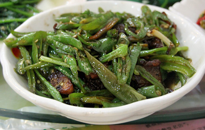 さて、このいかにも家庭料理っぽい炒めものだが、劉さんはこの料理が一番好きなのだそうで、これがあればご飯を何杯でも食べられる、とのこと。豚のひき肉と、赤いトウガラシと、青いトウガラシ、そしてニンニクの芽みたいなものを細かく切ったものを炒めたもの。かなり辛くて、かなり酸っぱい。しかし、これは劉さんの言うとおり、本当にうまい。辛くて酸っぱい料理の傑作だ。これ、なんとか再現できないだろうかと思い少し調べてみたら、どうやらニンニクの芽に見えたのは、ササゲという野菜を酸味が出るまで発酵させた漬物のようだ。そっか、酸味の漬物はいろいろあるので近いものは作れるかも。