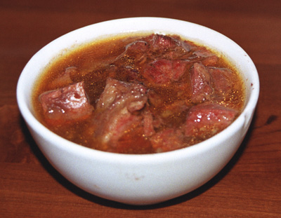 はじめはこれ。豚肉をショウユ味でトロトロに煮たもの。写真では大きく写っているが、片手で持てるほどの小椀である。これは、もう、ちょうど日本でいうところのよくあるモツ煮みたいな、なんということのない素朴な味だった。