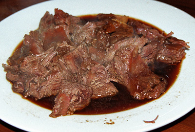 お次は北京ではきわめてポピュラーな醤肉(ジャン・ロウ)。お店の一画にはガラスごしの小部屋があって、そこでは巨大な寸胴の中にこの牛のすね肉がぐつぐつ煮えている。客は店員にグラム数を言って注文するらしく、料理人はその場で切り分けて出す。これも牛すね肉の香辛料入りショウユ煮そのもので、特になんということのないものだけど、日常の味な感じがいい。