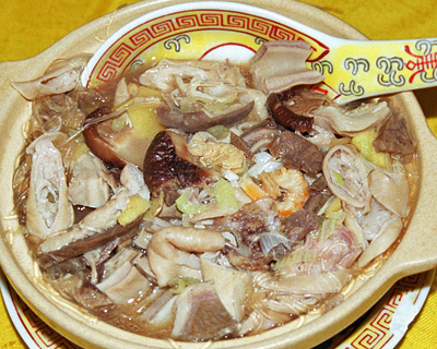 お次は、このお店のハイライトかもしれない、沙鍋下水(シャ・グオ・シャ・シュイ)である。本によると、豚の心臓、肝臓、肺、胃、腸、膵臓の6つの内臓を大なべで水煮して作ったものだそうである。内臓が嫌いな人には地獄のような光景だが、いろんな内臓それぞれの独特の味と、香りと、歯触りが楽しめてすばらしい。もっとも、ここまで内臓だらけだと、さすがにばくばく食ってると気持ち悪くなってきたのは確か。でも内臓が平気な人にはぜひ、お勧めする。