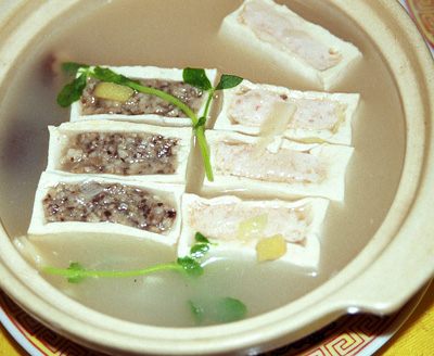 こちらは打って変わってやけに優しい味。豆腐に蝦ペーストと鶏ペーストをそれぞれ詰めて煮上げたもの。ふつうにあっさりしたお味である。