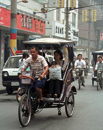 成都は近代的な都市であった。高層ビルもかなりの数建っており、街全体も広い。しかし、ビル沿いの大通りから一本道を中に入ると、突然、五十年前かと思わせるようなひどく古びた長屋街のようなものが現れる。2階建ての家が道沿いに連なり、1階部分は店舗になっていたりするが、2階部分が廃墟のように崩れかけた家も多い。車も走ってはいるが少ない。歩きと自転車、そして町じゅうでお目にかかる後ろに二人がけの座席を付けた自転車タクシーが走っている。この自転車タクシー、ちょっと見ると昔の人力車にも見え、それも手伝って、路地を入るといきなり何十年もタイムスリップしたような感じを受ける。
