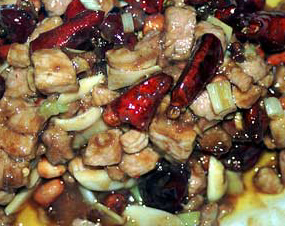 四川料理の有名な味付けのひとつ、宮保(ゴン・バオ)味で味付けした炒めもの。大量の干しトウガラシと粒山椒を多めの油でゆっくりと揚げて油に香りを移し、その油で材料を炒めて、甘酢の効いたショウユ味で調味したものである。四川原産の巨大なトウガラシがごろごろと入っているのでどんなにか辛いかと思うが、食ってみるとそれほどでもない。この四川の巨大トウガラシは、香りが良いのが特長で、辛みはほどほど、ということのようである。マーボードウフもそうだったが、日本のものに比べて、調味料や香辛料それぞれの味が際だっている。