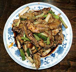 これは四川独特の椒麻(ジャオ・マ)と呼ばれる山椒ペーストを使った、豚の胃袋のあえものである。粒山椒と青ネギとショウガをペースト状になるまで叩いて作る。これにショウユ、酢、トウガラシ油などを合わせてタレとする。この料理は、ゆでた豚の胃袋をスライスして、ぶつ切りの青ネギと共に皿に盛り、先の椒麻タレをかけたものである。これは山椒のしびれが存分に味わえ、旨かった。日本で同じ料理を食べても、山椒の香りが漂っている程度だが、ここ四川の本場ものは、山椒がびりびりしびれ、濃厚なタレと共に誠に美味である。