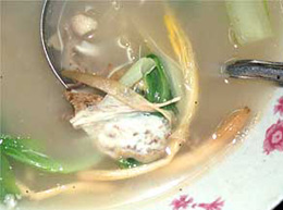 三鮮は、三つの生もの、あるいは三つの特別なもの、といった意味あいで、湯はスープを意味するので、これは三種の材料の入ったスープである。ここでは豚の腎臓、豚の胃袋、そして豚肉が入った白く濁った汁で、青菜とユリのつぼみが入っている。これはかなり生臭かった。どうやら、二種の内臓と肉を生のまま水でゆで、そこに塩と化学調味料を入れて味付けしているようである。成都のいくつかの料理店でスープを注文したが、いずれもダシ汁でなく水を使っているらしい、というのもなかなか面白い。材料の持ち味だけで飲ませるスープなのである。そこでこの三鮮湯だが、確かに生の腎臓と胃袋の味がし、すなわち結構生臭く、おいしいとは言いがたいが、こんなところにカルチャーの違いがでるのかな、と妙に感心したりもする。