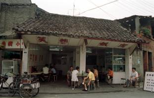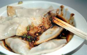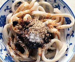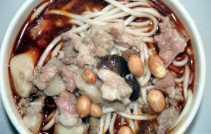 成都のお寺、文殊院の前にある店の、通りに面したガラス張りの調理場で作っていたのがこのあえ麺である。客のほとんどが注文しているようだったので、ここの名物麺なのであろう。太くて歯ごたえのある薄茶色がかった麺の上に何種類もの調味料がかけてあり、始めにまずぐるぐるとかき混ぜてから食う。具のたぐいは全くなく、麺と調味料だけの冷たいあえ麺である。こってりとした甘辛い味をベースに、トウガラシ油の辛み、山椒のしびれとゴマの香りなどが渾然一体となったまことに四川らしい味で、非常に美味であった。