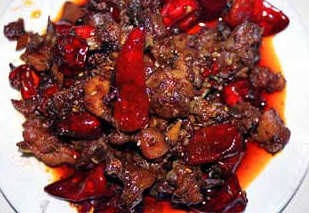 兎の肉を、干したミカンの皮、干しトウガラシと山椒と共にショウユで煮込んだポピュラーな冷菜。成都の人はよく兎を食べるようで、兎肉の料理は鶏肉と同列に並んでいて、至る所で食える。市場でも必ずと言っていいほど兎が売っている。この料理は味が非常に濃厚なため、兎肉の味の特徴は分からなかったが、蛙の肉のような、小骨の多い鶏肉のような感じだった。