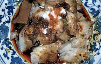 雲白肉(ユン・バイ・ロウ)と呼ばれる四川の名物一品料理である。この店で食べたこの料理は絶品であった。ゆで豚を薄切りにして、そこに甘辛いショウユ味のタレとたっぷりのラー油がかかっている。このラー油のおいしさはたとえようがない。日本の餃子に使ういわゆるラー油のラー油臭さと異なり、四川のそれは、四川原産の香りのよいトウガラシを臼で挽いたトウガラシ粉で作った赤い油で、一緒に入っている焦げたトウガラシが実に香ばしい。タレをかけた後、上にグラニュー糖が振りかけてあり、別皿に生ニンニクのみじん切りがついてきた。店のおばさんは片言の英語をしゃべり、この料理はとても辛いが大丈夫か、と聞いてきたが、食べたところ、辛さはむしろほどほどであった。四川料理はトウガラシをふんだんに使い、とても辛いのが特徴であるが、実際に味わってみると、むやみに辛いだけということはなく、実によく味のバランスが取れていて感心する。
