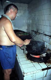 上半身裸の料理人が、手前にあるガス台に、普通見る中華鍋より肉厚の鉄鍋を乗せ、ごうごうともの凄い音をたてる強烈な火の上で、次々と料理を作っている。日本の中華料理店の火力もかなりのものだが、やはりここ中国で見ると、何となく迫力が違う。まさに豪火としか言いようのない強烈な火で、見た目もすごいが、ごーっというものすごい音に圧倒される。
