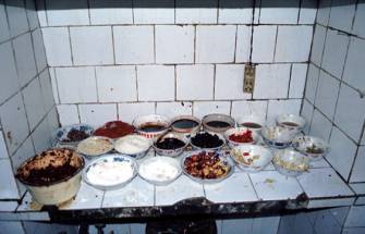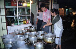夜市の立った通りの路地を入ったところに食い物屋が集合したところがある。写真の店はそのひとつで、店のやり手のおばちゃんが、道行く人にかたっぱしから声をかけ、次々と店に呼び込んでくる。店の前には、牛肉のショウユ煮、野菜の煮物、スープなどが煮立っている。この反対側には各種蒸し肉が大きなセイロの上で蒸しあがっている。指差しで注文し、店内で食う。このときは、前項で紹介した蒸し肉を2種と、牛すね肉のスープとご飯を注文した。いずれの料理も荒削りだったが、旨かった。ちなみに四川のご飯は日本と同じ短粒米であった。