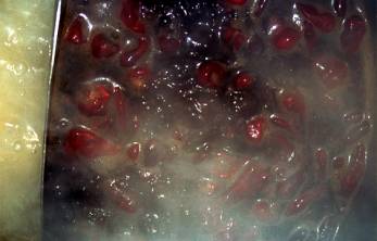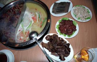 成都でもっともポピュラーかつ高級な火鍋専門店と思われる皇城老媽での二色火鍋である。鍋が二つに仕切られていて、片方にいわゆる四川独特の煮汁が入り、もう片方には豚骨や豚の胃袋などで取った白い出し汁である白湯(パイ・タン)が入っている。ご覧の通り、四川のそれは、四川原産の巨大な干しトウガラシのぶつ切りが大量に浮かんで、表面を覆っている。真っ黒いダシは、ショウユ、豆鼓がベースで、大量の粒山椒と、漢方薬系の香りがついている。ちなみに回りを見回すと客のほとんどは、この四川タレのみの鍋を注文していた。