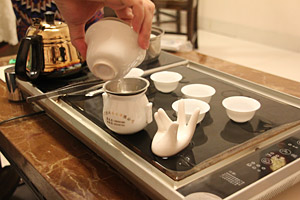 この電気式の機械は中国のオフィスにはどこでも入っているポピュラーなものだそうだ。お湯を沸かして、茶碗を温めて、お茶をたててお湯を捨てて、などすべて機能が揃っていて、よくできてる。