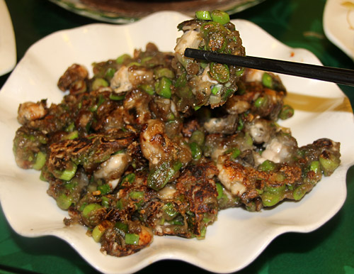さあ、こちらも今日のハイライトの一つ、赤キノコと豚足の煮込みスープ。写真に写った赤黒い感じのものが、おそらく紅菇(ホン・グゥ)と呼ばれる赤い乾燥キノコで、その下にあるのが豚足のぶつ切りだ。紅菇はスープに入れるとスープを赤く染めるそうで、見てのとおり少し紫がかった赤でとてもきれい。スープのお味はこれまたあっさりとしているけどしっかりしたダシ味で、すばらしい。アモイの料理はこういう蒸しスープが特徴のようである。すべてのスープが違うダシを使っていて、感心する。そういえば、かの、有名な高級蒸しスープ料理の佛跳牆(フォー・ティャオ・チァン)は福建料理の代表だもんね、納得。