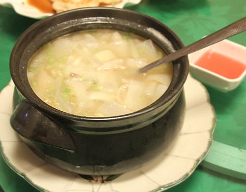 さあ、でた。これも本日のハイライトの一つ。魚唇と大根の煮込みスープ。「魚の唇です」と紹介されて出てきたので、え、なにそれ? だったのだが、後で調べてみたらこれは魚唇(ユイ・チェン)と呼ばれるフカヒレの縁側という食材だった。5ミリ厚ぐらいのカルタ型に切ってある真っ白な魚唇。そして、これが面白いと思うのだけど、まったく同じ形に切ったやはり真っ白な大根が同じだけ入っている。一見同じに見えるけど、食べると全然違う。魚唇は食べてみると、ぐにゃっと柔らかく歯にまとわり付くほどねっとりした独特の食感で、そのほとんどがコラーゲンでできているそうだ。煮込みのスープも真っ白で、たぶん豚の胃を使った独特の獣臭がある濃厚な味。写真の右向こうに見えているのは紅醋(ホン・ツウ: 赤酢)で、これをさらっとかけて臭みを和らげていただく。これは、すばらしい料理だった。