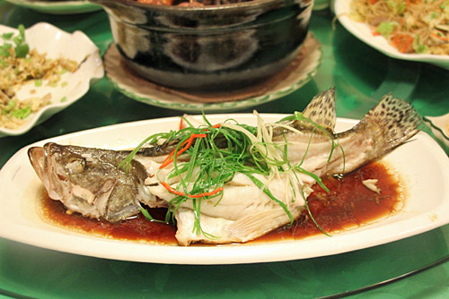 はい、これが最後の、豆腐のようにふるふるに柔らかい白身魚のショウユ煮。日本でいうとどうやらハゼのような魚らしい。ぶつ切りの青ネギと一緒に食べる甘辛い味、美味。