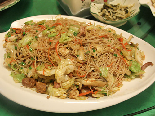 コースでは定番の麺料理、こちらはビーフンの炒めである。たくさんの野菜と缶詰肉が入ったまさに家庭の味という感じのやさしくて飽きの来ないショウユ味の焼きビーフンである。