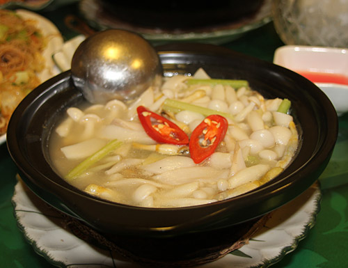 お次はキノコのスープ煮。こちらのスープはあっさりとした塩味で、何のキノコかは聞き忘れたけど、シメジのような、大きなエノキのような感じのキノコがふんだんに入った優しい味である。