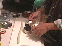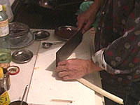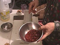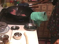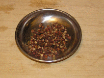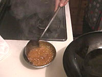 花椒(山椒のこと)は、トウガラシと並んで四川料理の必須アイテムである。日本の山椒と風味は異なり、口に入れると舌をビリビリとしびれされる働きをすることが特徴である。四川人はあのしびれる感覚が好きらしい。ここでも是非、中国の花椒をミルで挽いた粉を使いたいところである。日本の、あの、うなぎにかけたりする粉山椒では、かなりいただけない。 作り方 1)ネギショウガを切る ![]() ネギは荒みじん切り、ショウガはみじん切りにする。 2) 挽肉を炒める ![]() 中華鍋をよく空焼きして、挽肉とショウガを入れ、杓子の背で挽肉つぶしながら、ほぐし、パラパラに炒める。中華なべの空焼きについては「麻婆豆腐」の項を参照のこと 3) 挽肉に味をつける ![]() 挽肉によく火が通って、油が澄んだ感じになってきたら、ショウユ大1、酒大1を入れてさらに水気がなくなるぐらいまで炒めて火を止め、皿にとっておく。 4)ショウユと芝麻醤を混ぜる ![]() ショウユ大1と芝麻醤大1/2をボールに合わせて粒がなくなるまでよく混ぜ合わせておく。ショウユと芝麻醤が2対1の割合である。芝麻醤は冷たいと混ざりにくいので、ちょっと暖めるとよい。 5) 花椒を挽く ![]() ホールの花椒をミルで粉状になるまで挽いておく。 6) 麺をゆでる ![]() 細うどんの乾麺を、表示どおりの時間ゆでる。 7) 調味料を合わせる ![]() うどんをゆでている間に調味料を合わせる。一人前の小碗を用意し、ここに、ショウユと芝麻醤を混ぜたものを大2/3、ラー油を大1、ゴマ油小1、花椒粉小1/2を入れておく。 8) 麺の水切り ![]() 麺をザルに上げ、水洗いしてぬめりをとる。このとき、水でやってもいいが、麺がちょっと暖かい方がおいしいので、自分は、湯沸かし器のお湯でもみ洗いして麺の温度があまり下がらないようにしている。洗ったら、水気を切る。 9) 麺を入れて仕上げ ![]() 調味料の上に麺を入れ、麺の上に炒めた挽肉大2とネギの荒みじん切りを乗せて出来上がりである。このまま上卓し、食べるときめいめいが全体をよく混ぜ合わせてから食べる。 本場風の辣油の作り方 材料と調味料