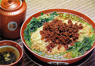 ![]() さて、中華料理大研究の2回目は同じく四川料理のタンタン麺である。日本のラーメンへの情熱はご存知すごいものがあるが、このタンタン麺もさいきん、醤油、塩、豚骨に続くラーメンジャンルの中のひとつに格上げされたようである。前回の麻婆豆腐と同じく、トウガラシと山椒を効かせた本場四川風と銘打ったものがおしなべて評価が高い。しかし、このタンタン麺、日本ではポピュラーになっているけれど、故郷の四川省ではごくごく大衆的な目立たない料理のようである。それから、これはみなさんご存知のように本場のものはスープ麺ではなく、汁のない和え面である。 ということで、ここでは、本場の汁なし系をメインに、その由来や作り方などについて解説してみることにしよう。 由来
