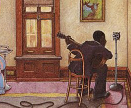 ところで、前述の置物スペースだが、ここには、実は、ロバート・ジョンソンのアルバムのジャケットに描かれている情景の3次元模型を製作して、それを設置する、という案を考えていたのである。かの、古風なホテルの一室で、マイクを一本立ててその前でロバート・ジョンソンが歌っている、あの配置である。それで、このモデルを四方から豆電球で照明して、その照明の明るさが音に合わせて明滅する、そんな企画を立てたのである。これも奥さんに依頼したのだが、さすがに大変で、いつになっても上がってこない。仕方ないのであきらめて、古道具屋で買ったいぶした黒い板を台座のようにネジ止めして、スペースの間を持たせた。まあ、好きなものをここに置いてください、とでもいったところ。