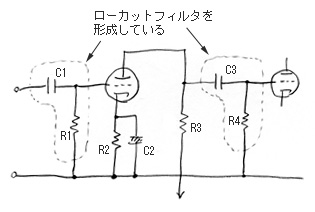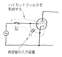 この場合、この真空管を駆動する前段の内部抵抗Roと、図のようにハイカットフィルタを形成するので、ハイが落ちる。