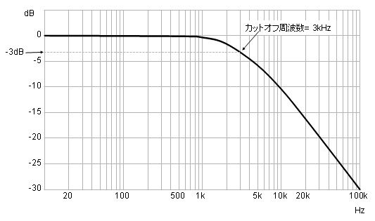 A = 20 log10 a …(1式)例えば2倍の場合は、20 log10 2 ≒ 6dB、0.5倍は20 log10 0.5 ≒ -6dBである。このように、増幅では値がプラスに、減衰ではマイナスになる。また、多段増幅回路などで、例えば100倍の回路を2段つなぐと、掛け算して100×100=10000倍の増幅器になるが、デシベルではこれが足し算になる。100倍は40dB (= 20 log10 100)なので、2段つなげると40+40=80dBの増幅回路になる。周波数特性でよく出てくるのが-3dBで、比率では約0.7である。また、-1dBは約0.9である。図の周波数特性はこのdBを使って描いた特性になっている。ここで、-3dB(つまり信号が0.7倍に落ちたポイント)の周波数をカットオフ周波数といい、次の式で計算できる。