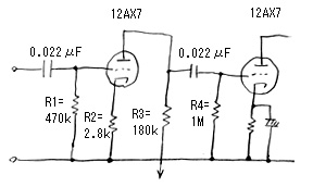 例として、図のように12AX7の2段増幅で、1段目の12AX7をカソードバイパスコンデンサを抜きにして使ったとする。