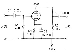 真空管の入力容量については、詳しくは他書に譲るが、5極管の場合、数pFでほとんど問題にならないが、3極管では数十から数百pFになることがあり要注意である。これまでに出てきた回路のようなカソード接地の場合、入力容量は真空管の増幅率が大きいほど大きくなり、12AX7で約100pF、12AU7で約20pF、2A3で約60pFぐらいの値である(ミラー効果と呼ばれる現象により、増幅率が大きいほど見かけの入力容量が増加する)。