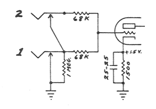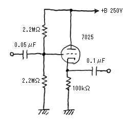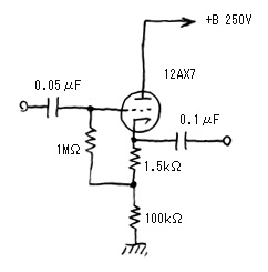 ここでは、ギターのシールドを突っ込むアンプの入力回路について簡単な説明をしておこう。製作編のアンプの回路では図のようにきわめてそっけない入力回路を使っている。入力は一つだけで、入力ジャックの後ろに、グリッドに並列に1MΩの抵抗が入っているだけである。
