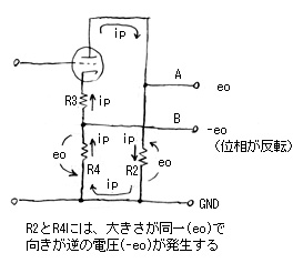 上述の原理をよくよく見ると分かるが、R6の両端の信号を右側真空管で増幅して出力2が出てくるわけだから当然といえば、当然である。