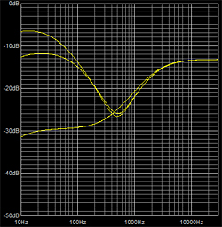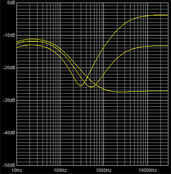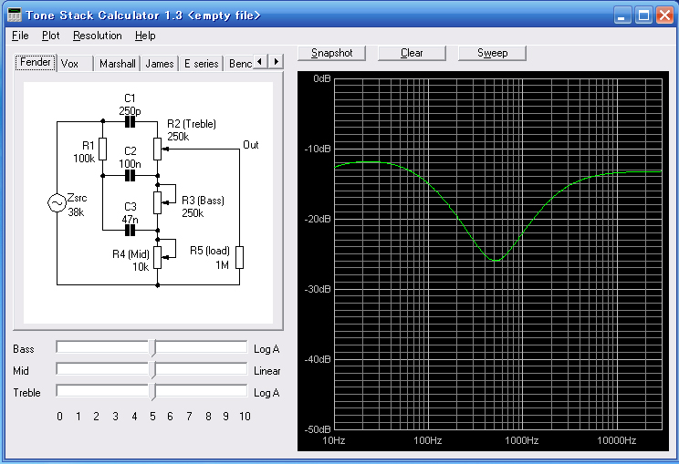 ギターアンプのトーンコントロール回路で何といっても定番なのが下の左の図のようなFenderの回路である。さて、常識的に考えると、これら3つのツマミをすべて真ん中にしたとき周波数特性がフラットになり、それを基準として3つのツマミをプラスマイナスに振ることで高中低域の周波数特性を上下できると思うのが自然であろう。ちょうどグラフィックイコライザーのノリである。しかし、実はこの回路ではそうなっていない。この回路でツマミを全部真ん中にすると下の右の図のような周波数特性になる。