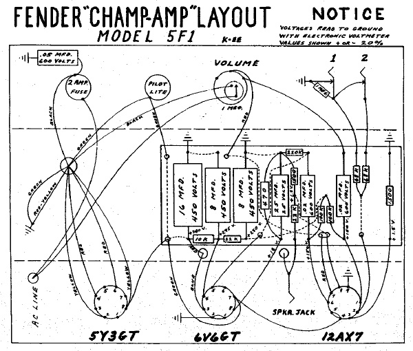 http://www.schematicheaven.com/fender.htm)をネットであさると、この実体配線図もだいたい一緒になって載っているので、その通り作ってみるのも手である。文末に今回のプロジェクトの元になっているFender Champ (5F1)の配線図を載せておく。ただ、見ての通りこれは業務用なので実体配線図とはちょっと違い、まあ、配線図ていどのものである。